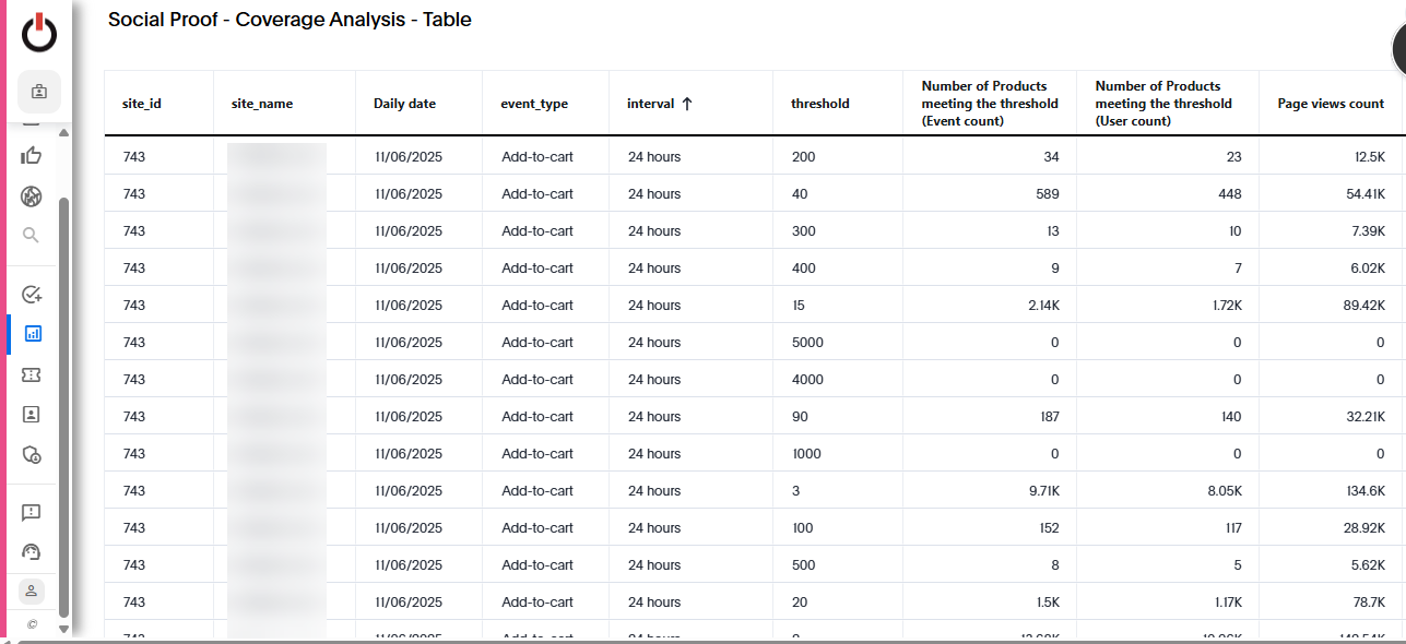 A new Social Proof Coverage Analysis report is now available, enabling users to evaluate how many products meet specific thresholds across different intervals and metrics. This helps Digital Optimization Managers identify appropriate thresholds and intervals based on actual product coverage.