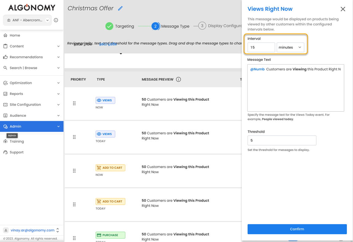 In this release, we have enhanced Social Proof by allowing Digital Optimization Managers to conveniently view and adjust interval settings within the user interface for each message type, eliminating the need for JavaScript code modification.