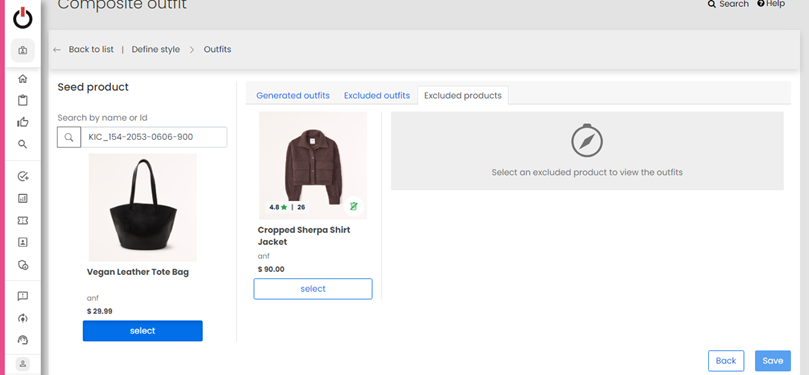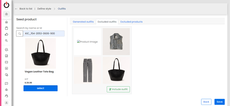 Additionally, merchandisers have the ability to review the list of excluded products and the outfits associated with each excluded product. If needed, they can easily include a previously excluded product back into the outfits. This action triggers an update to the list of outfits, reflecting the new sorting order based on the product's ranks.