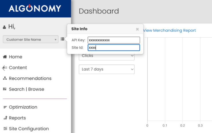 A unique key that identifies the site. Each Algonomy client has a unique API key to separate data and traffic from other clients. This is provided by Algonomy. Example: apiKey=4faeaf752ee40a0f |