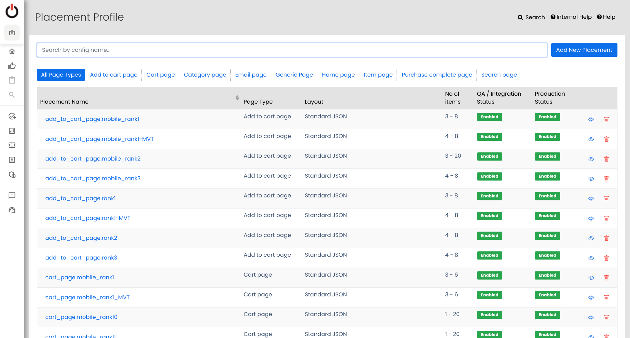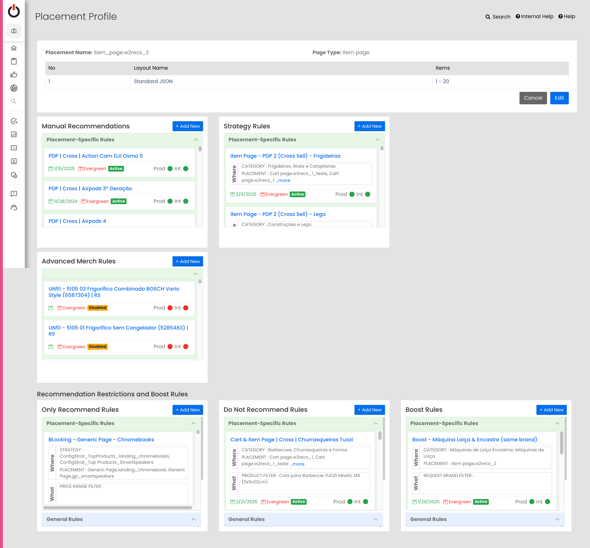 Displays all Recommend placements in a searchable, filterable table that includes page type, layout, item count, and status for both Integration and Production environments. Users can navigate directly to individual Placement Profile pages, add new placements, or update statuses using a guided modal. Together, these enhancements improve placement visibility, rule traceability, and operational efficiency across environments.
