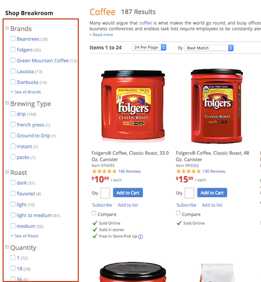 In addition, Discover currently does not support generation of facets. A facet is the navigational item found on the left-hand side of Search and Browse pages that enable the customer to choose what filters to apply. Here's an example.