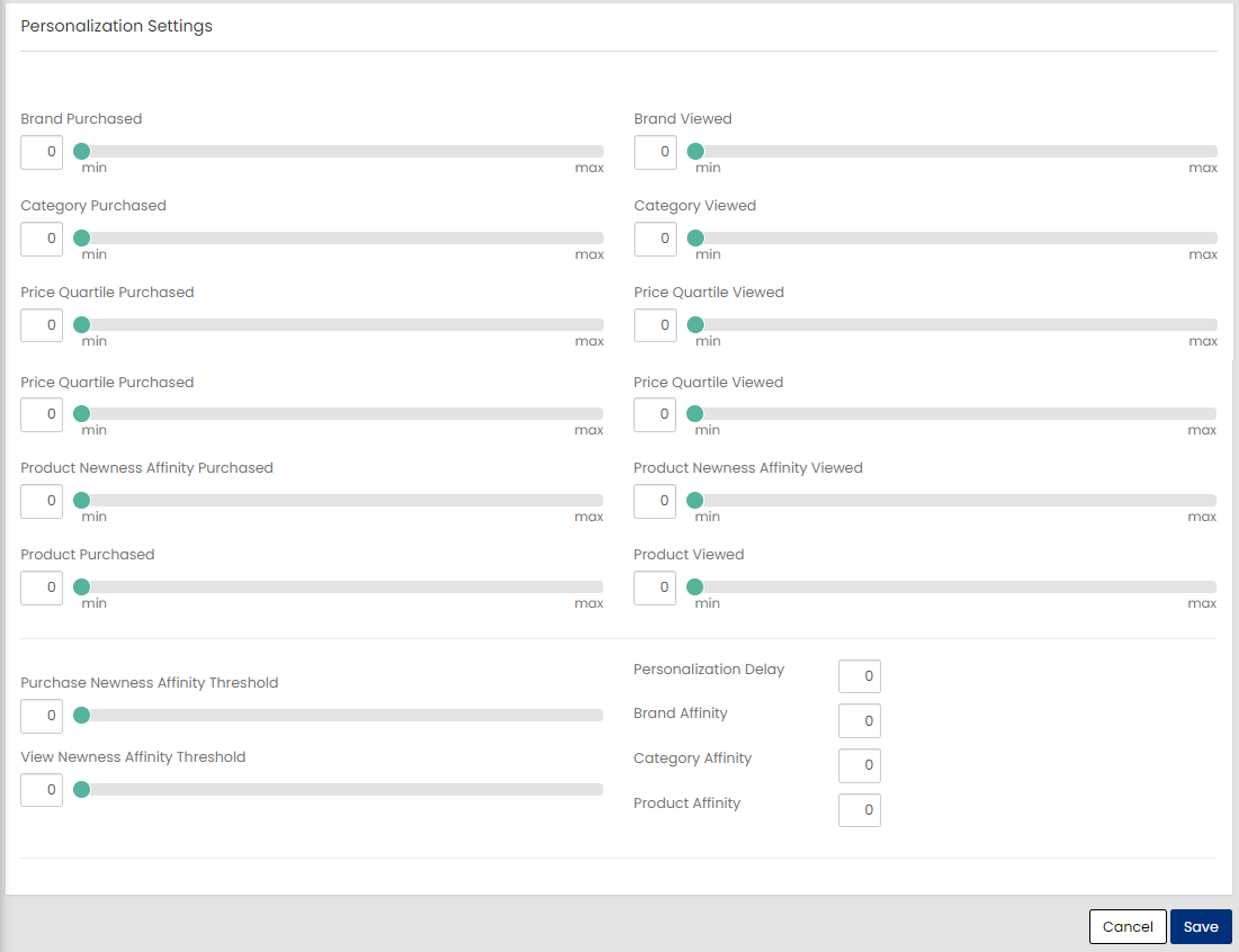 The following attributes are displayed under Personalization Settings. These settings control personalization-based boosting applied during search result ranking, based on a shopper’s past behavior (views and purchases).